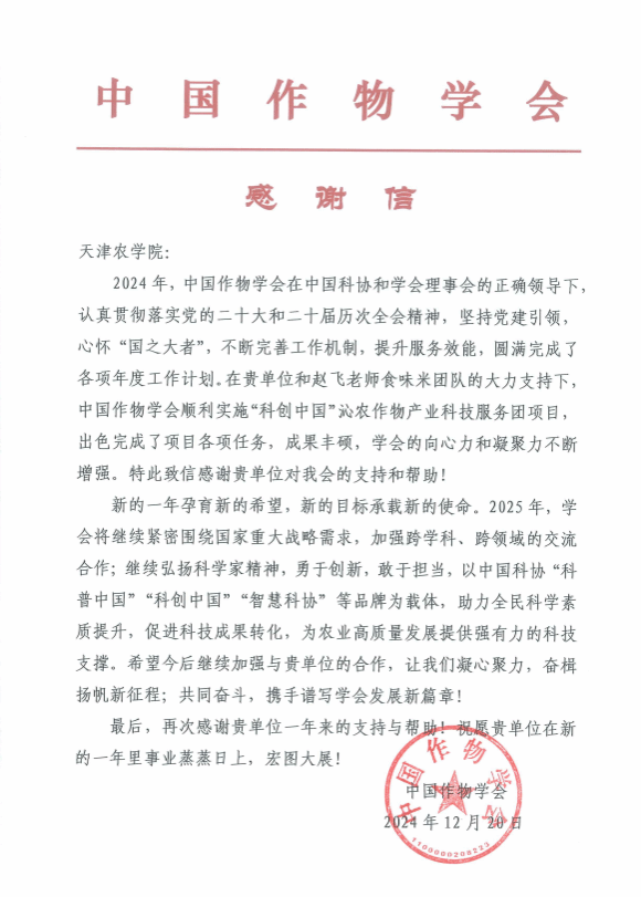 我校收到中国作物学会的感谢信