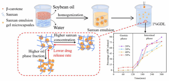 亲脂性生物活性物质在调节生理功能、预防疾病以及维护人体健康方面发挥着至关重要的作用。其中,β-胡萝卜素作为一种典型的亲脂性生物活性物质,存在水溶性差的问题,并且容易受到光、热、氧等因素的影响,这使得其口服生物利用度较低,从而限制了它在实际中的应用。论文研制了三赞胶Pickering乳液凝胶微胶囊,优化了三赞胶浓度、油相比例、固定液种类及固定时间等参数,制备得到的乳液粒径为298.4nm,电位为48.6mV,稳定性良好,乳液凝胶中的油滴均匀分布在三赞胶凝胶网络中,形成光滑致密的波状结构,微胶囊的孔隙率可以由三赞胶浓度和油相分数共同调节。体外模拟消化试验表明,微胶囊在模拟胃液中能有效保护β-胡萝卜素,释放率为0.56%,在模拟肠液中可实现缓慢释放,释放率为66.2%。研究成果为三赞胶在亲脂性生物活性物质递送系统中的应用提供了理论支持,为后续三赞胶相关医药产品的开发指明了方向。