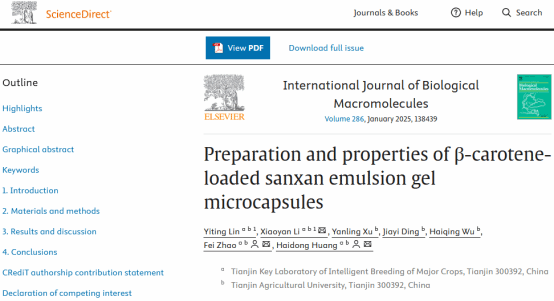 近日,21级菌物科学与工程专业本科同学林仪婷在黄海东教授的指导下,以第一作者在高分子科学领域Top期刊《International Journal of Biological Macromolecules》(中科院一区,IF 7.7)上发表了题为“Preparation and properties of β-carotene-loaded sanxan emulsion gel microcapsules”的高水平学术论文。微生物多糖团队的李晓雁老师为共同第一作者,赵飞老师、黄海东老师为通讯作者。